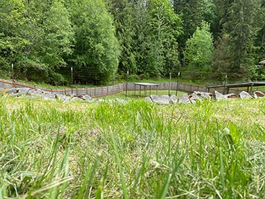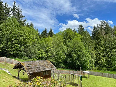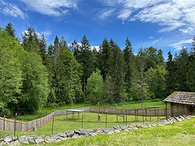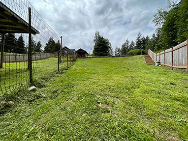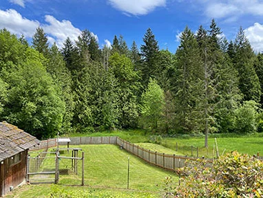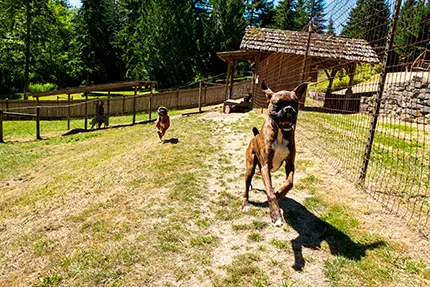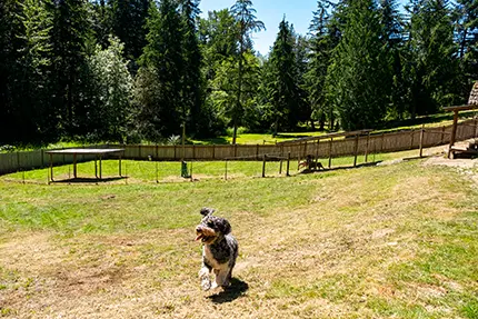 Your dog will be safe at the ranch. Our property is surrounded by a 6 foot high solid cedar fence, and our off leash areas are enclosed by a fence within another fence. So even if your little Houdini were able to escape the kennel or the off leash area, he or she is still safely enclosed by our 6 foot fences. At night your dog will be indoors and the doggie doors will be secured.